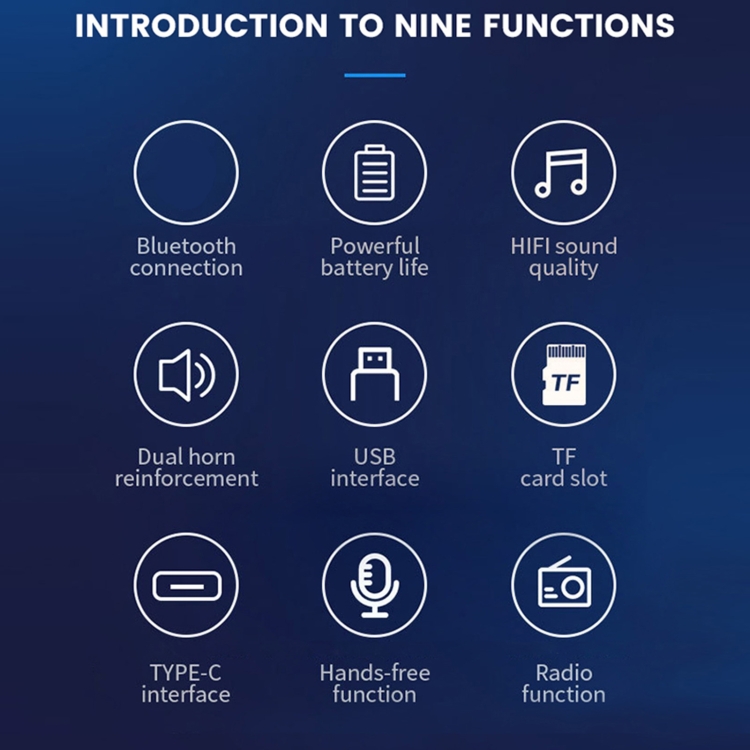 11. TWS Function, 360-degree stereo sound, specially designed with the TWS function for a room-filling stereo sound to provide 3D stereo surround sound.