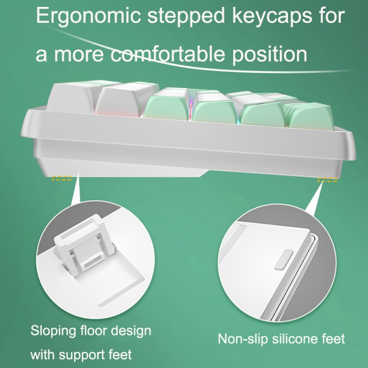 11. Ramped floor design and support feet with ergonomic stepped keycaps for a more comfortable position