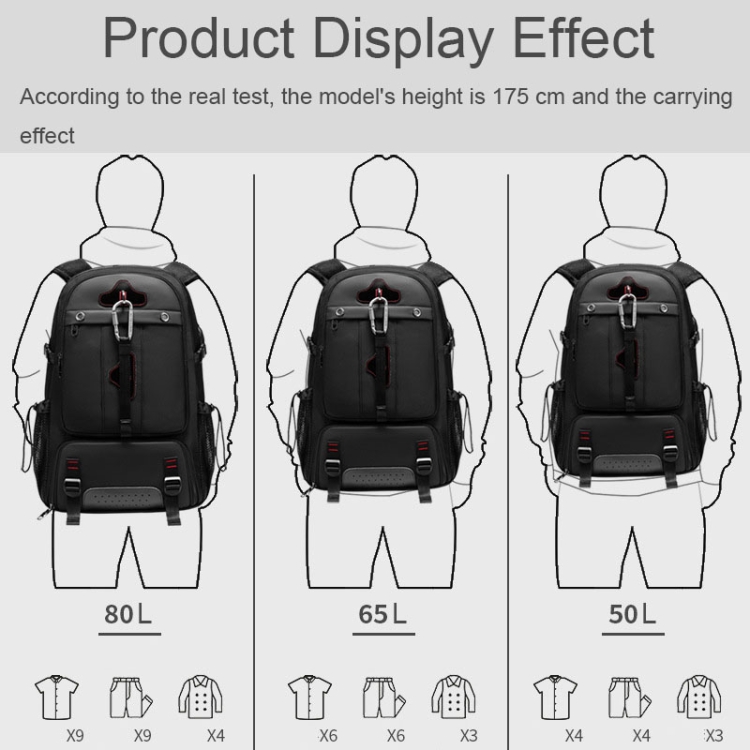 5. Dimensions: 50L: 48 x 33 x 17 cm, 65L: 53 x 30 x 16 cm, 80L: 60 x 40 x 23 cm
