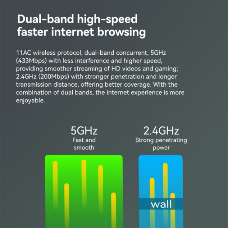 5.Signal rate: 650Mbps (2.4GHz 200Mbps, 5GHz 433Mbps)