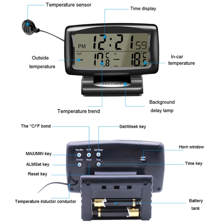 LCD Night Light Car Clock Automotive Electronics Inside And Outside Dual Thermometer