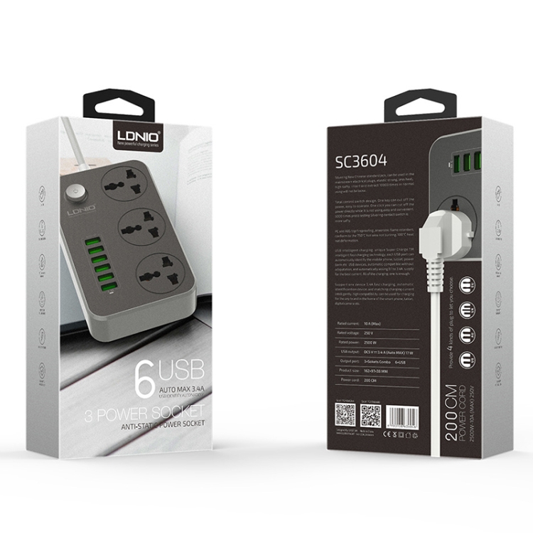 LDNIO SC3604 6 x USB Ports Multi-function Travel Home Office Socket, Cable Length: 2m, US Plug