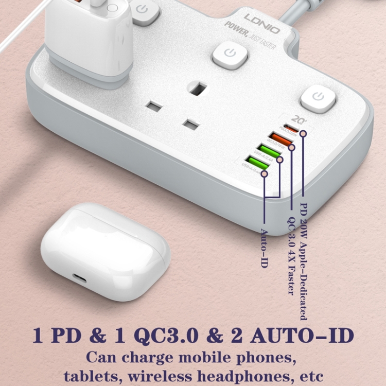 1. PD+QC 3.0+2 auto-recognition for charging cell phones, tablets, wireless headphones, etc.