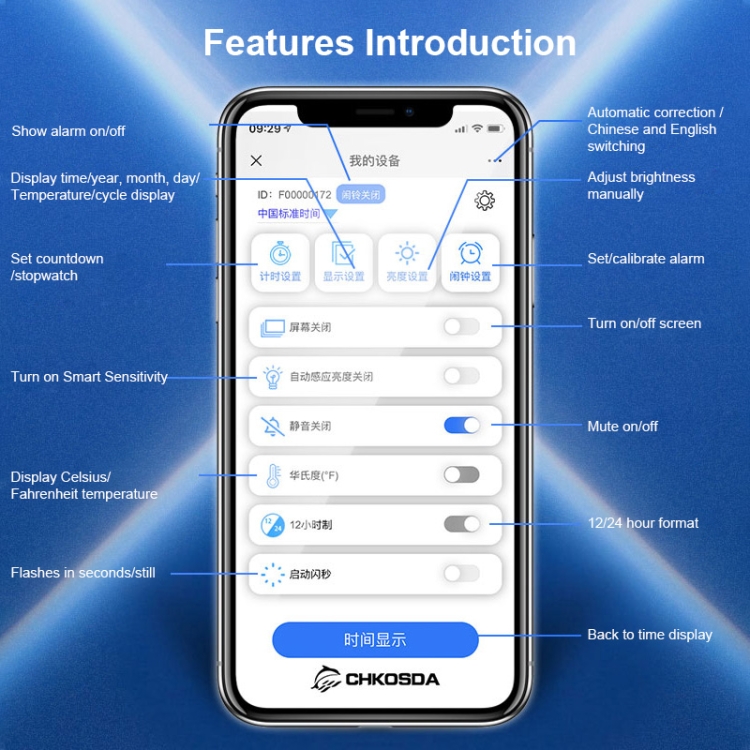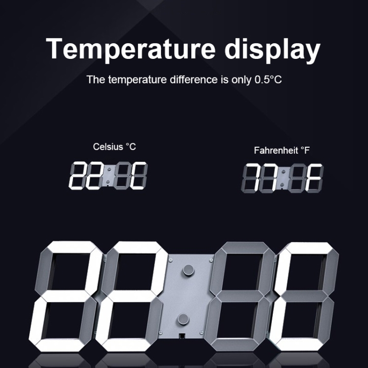 6. Function: mobile phone remote control, 5 groups of alarms, stopwatch, 999 days countdown, temperature display, calendar, intelligent light adjustment / manual 8-position brightness adjustment, power off memory function will not reset the time