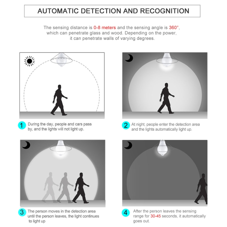 4. Working principle: Within the range of the sensor, it will turn on and work for about 30-45 seconds. After 30 seconds. If you do not move, the indicator light will go out. It only works in a dark environment or at night.