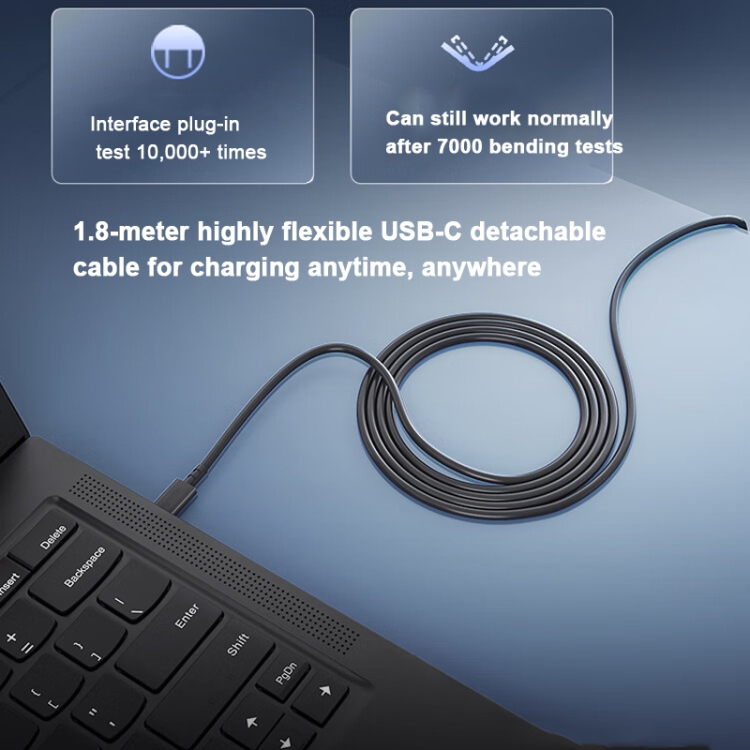 3. 1.8-meter highly elastic USB-C detachable cable for charging anytime and anywhere. V0 flame-retardant TPE outer material, feels as delicate as skin and is wear-resistant and tough, not easy to break.
