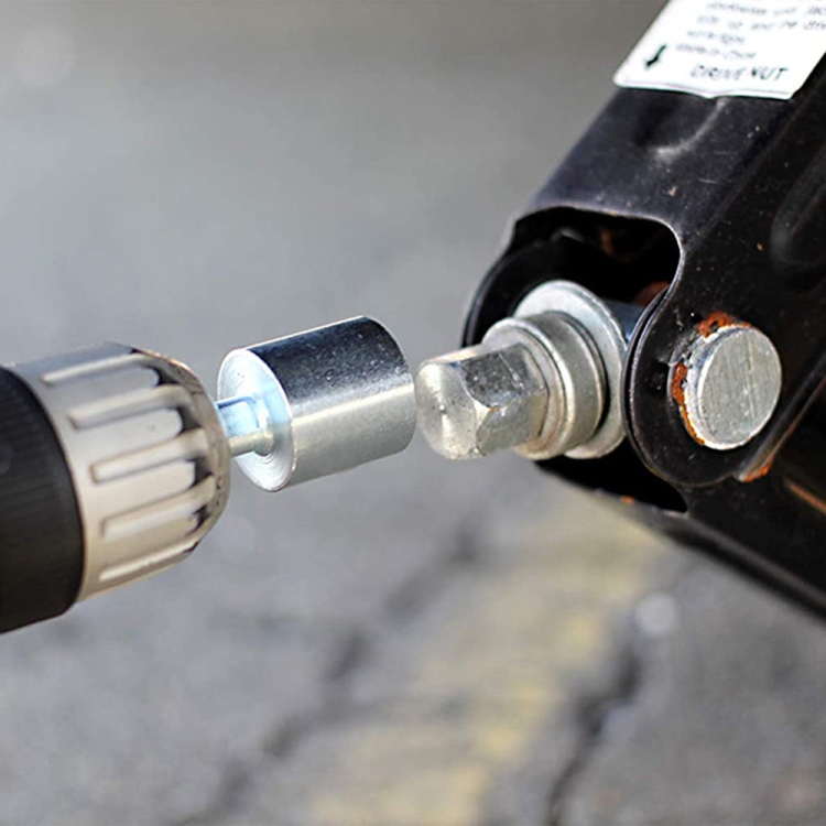 8. Works with all 3/4″ hex drive jacks and uses torque from a power drill to raise and lower the jack. Simply plug the Scissor Jack Socket into your drill, connect it to the scissor jack, and press the trigger to raise or lower the scissor jack on the drill.
