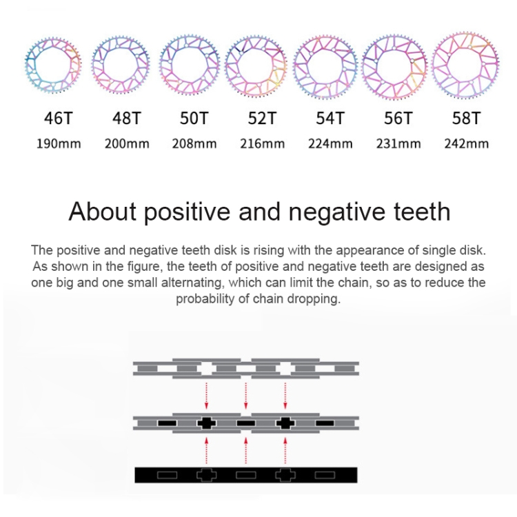 4. Diameter: 50T 208 mm, 52T 216 mm, 54T 224 mm, 56T 231 mm, 58T 242 mm