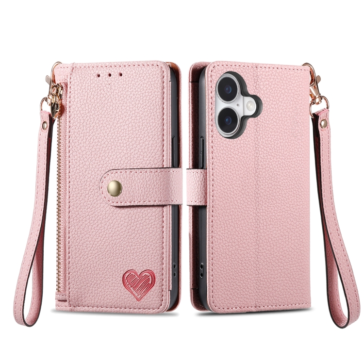Love Zipper Lanyard Leather Phone Case, For iPhone 16, For iPhone 15 Pro Max, For iPhone 15 Pro, For iPhone 15 Plus