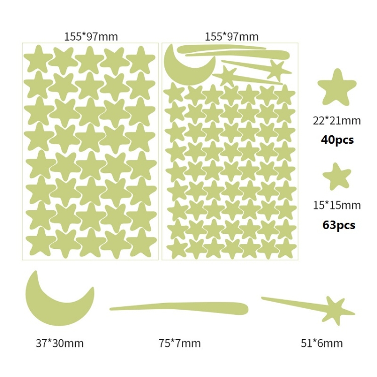 7. Size: 407PCS dots: 20 x 8 x 2 cm; 103PCS stars + shooting stars: 15.5 x 9.7 cm; 104PCS: 15 x 20 cm; 252PCS dots + moon: 12 x 20 cm+8 x 10 cm
