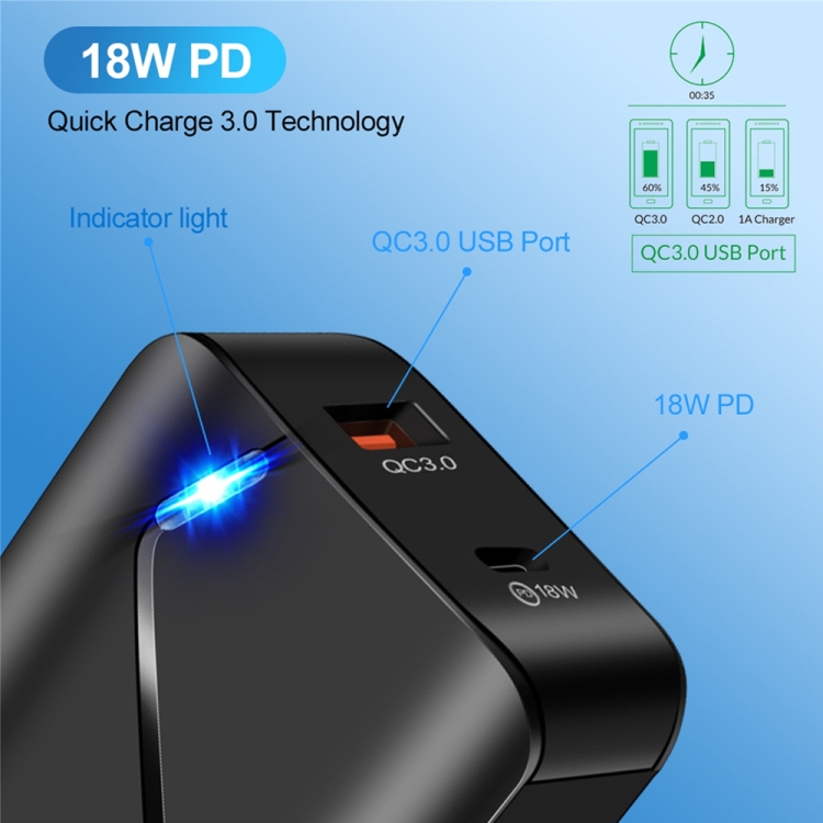 LZ-819A+C QC3.0 USB + PD 18W USB-C / Type-C Interfaces Travel Charger with Indicator Light, US Plug