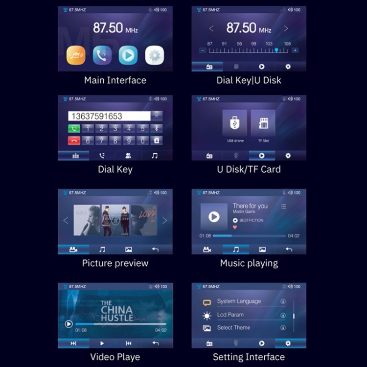 1. 4.3-inch large screen display, rich APP interface design: FM radio, Bluetooth answering, MP5 playback.