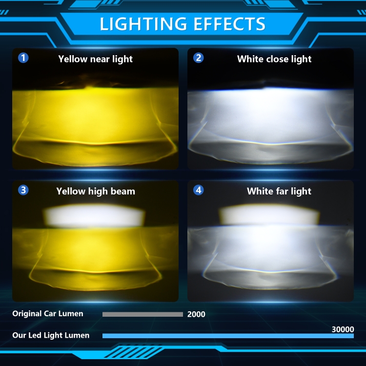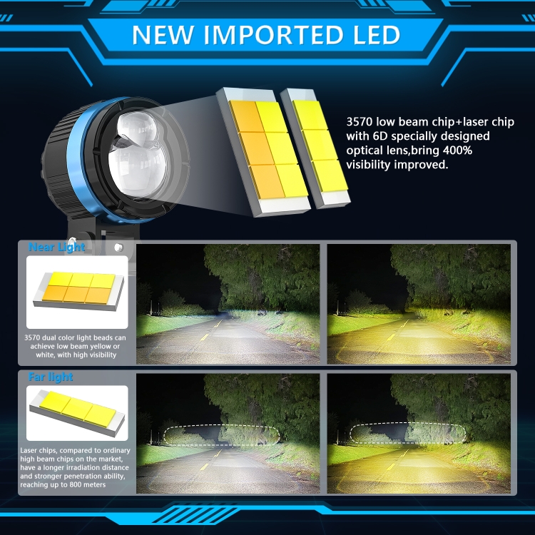 3. This lamp adds four modes: low beam or high beam, which can switch between yellow and white light at will, cold white light for low beam, amber light for low beam, cool white light for high beam, and amber light for high beam, which increases driving fun.