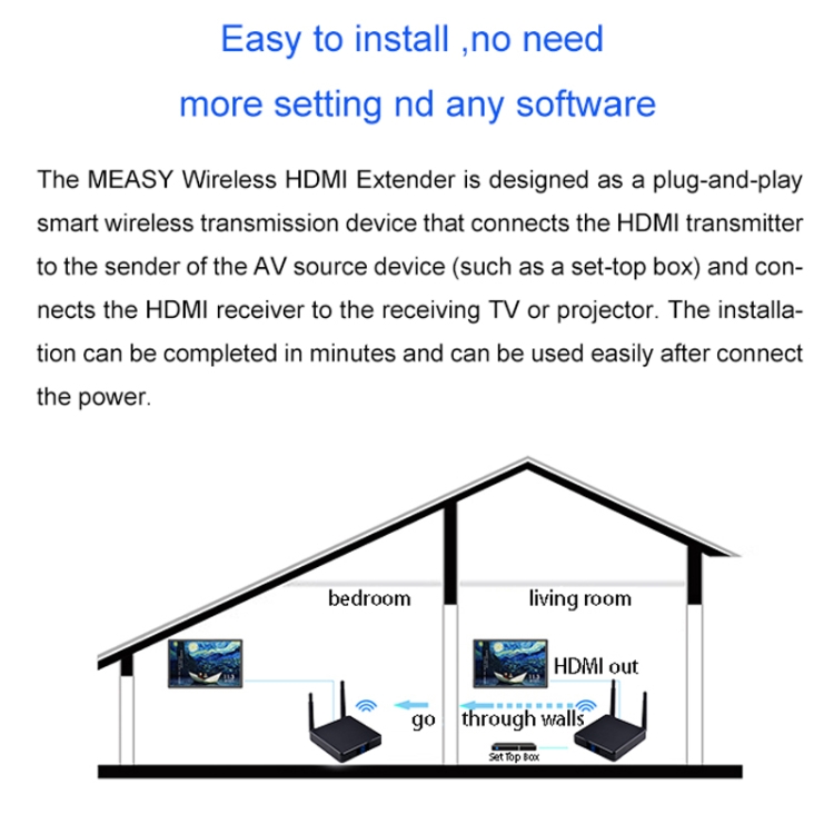 1. MEASY FHD686 wireless HD Multimedia Interface extender transmits full HD audio and video from any device source to the TV wirelessly.