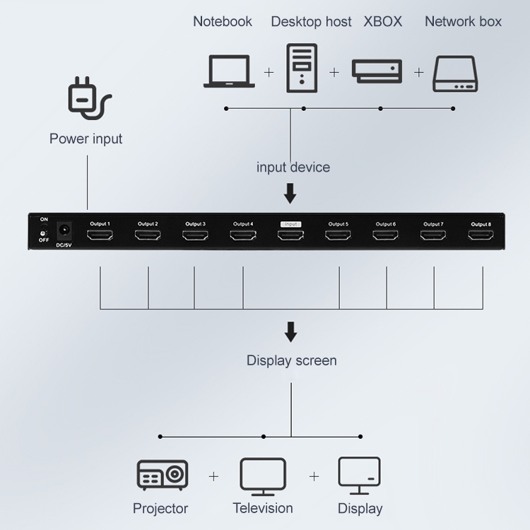 1. It can connect 8 TVs, projectors and other devices with HDMI interface at the same time.