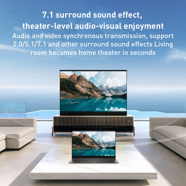 4. 7.1 surround sound effect: Audio and video are transmitted synchronously, supporting 2.0/5.1/7.1 surround sound effects, and the living room becomes a home theater in seconds.