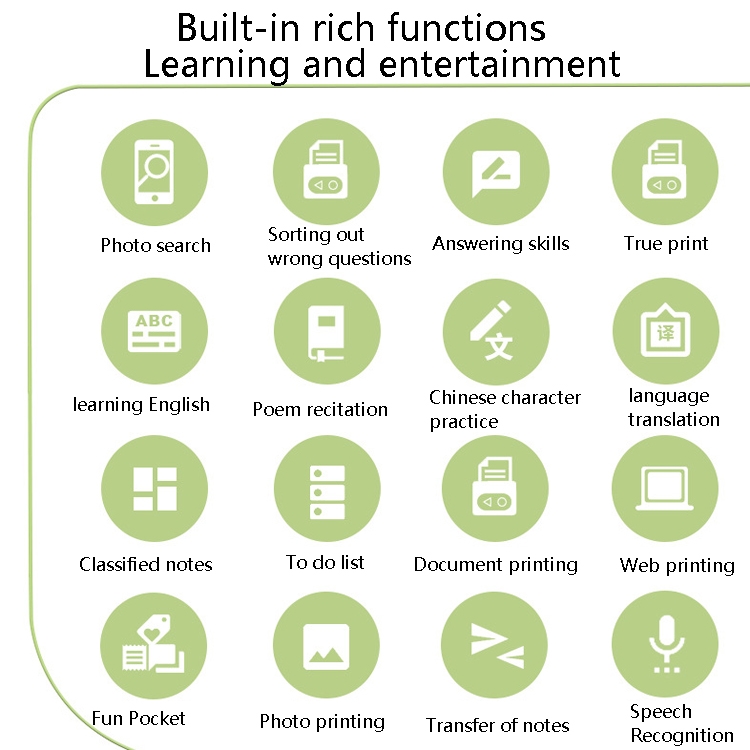 8. Functions: Take photos to search for questions, sort out wrong questions, answer skills, print real questions, learn English, recite poems, Chinese characters practice, language translation, classified notes, to-do list, document printing, web page printing, interesting handbook, photo printing, Note transfer, voice recognition