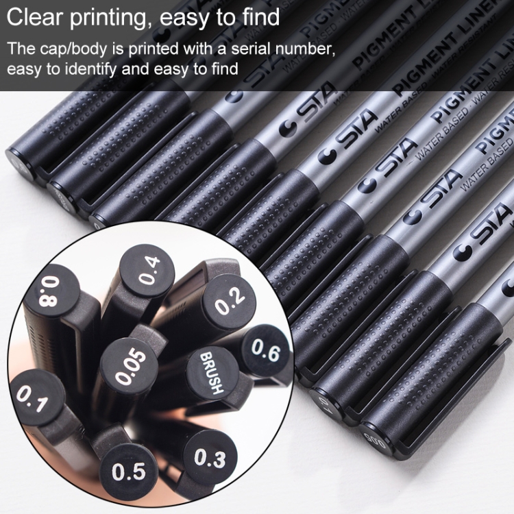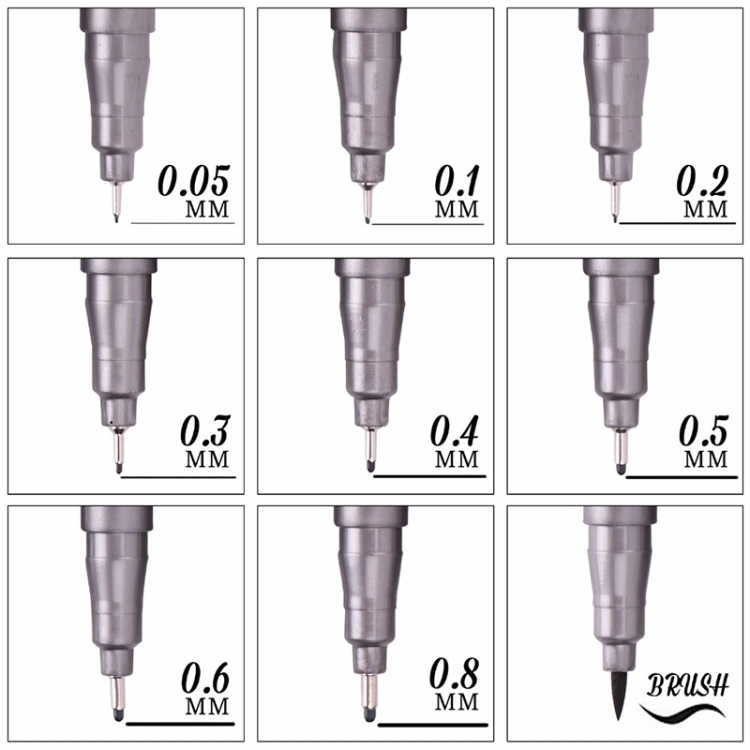 Nib sizes for precise line width are 0.05mm, 0.1mm, 0.2mm, 0.3mm, 0.4mm, 0.5mm, 0.6mm and 0.8mm, brush respectively