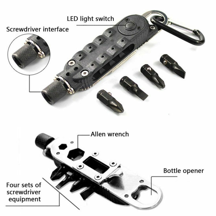 3. Function introduction: screwdriver x 4 (big one, small one, big cross, small cross), hexagon wrench x 2, bottle opener x 2, LED emergency light, D-shaped hanging buckle