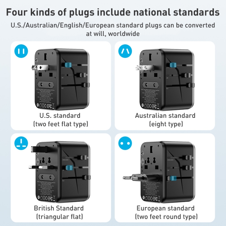 6. The US/Australia/UK/EU plugs can be freely converted to easily solve the charging problem of traveling around the world.
