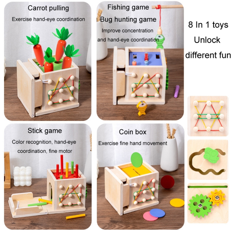 4. 8 in 1 multifunctional early education toys, play a variety of ways, pulling carrots, fishing games, catching bugs, stick games, coin box, unlock different fun