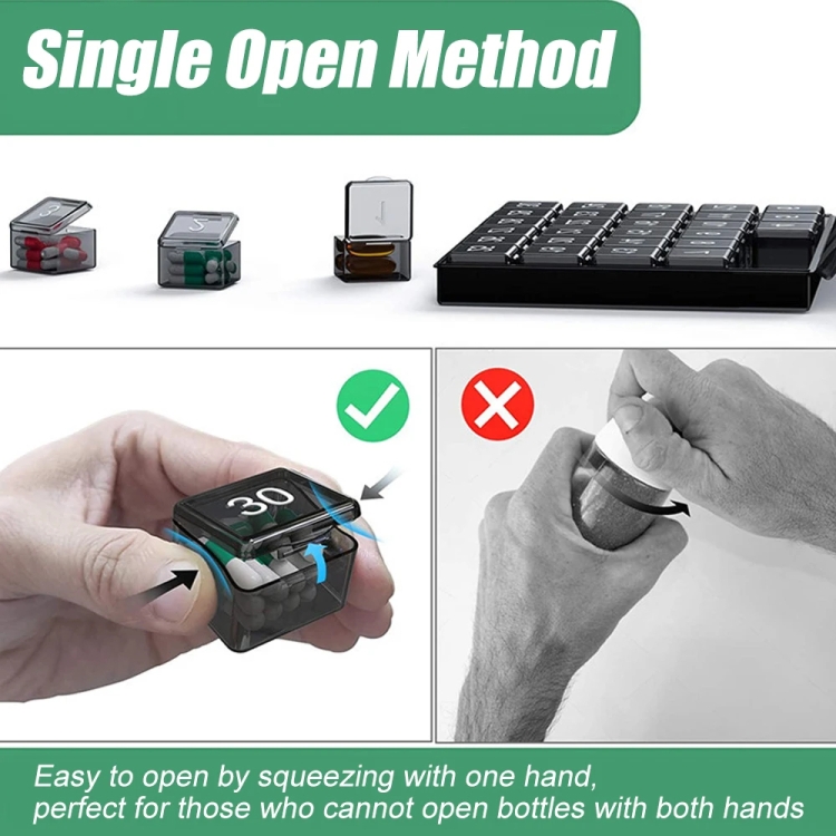 1. The pill box has 30 independent small pill boxes with a total size of 21.2 x 18 x 2.7cm and a single compartment size of 3.4 x 3.2 x 2.4cm