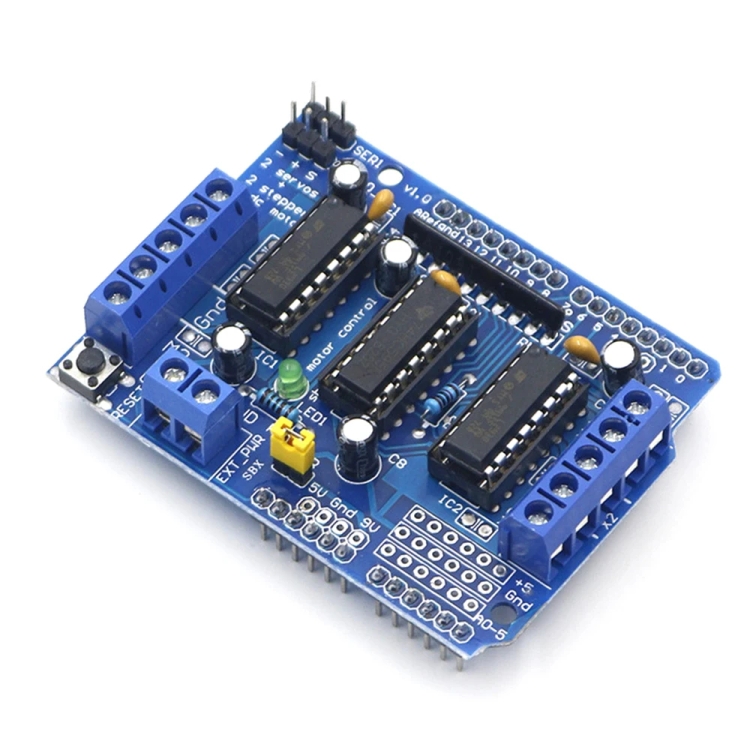 4. It can drive 4-channel DC motors or 2-channel stepper motors and also drive 2-channel servos. It supports Arduin UNO and Arduin Mega 2560.
