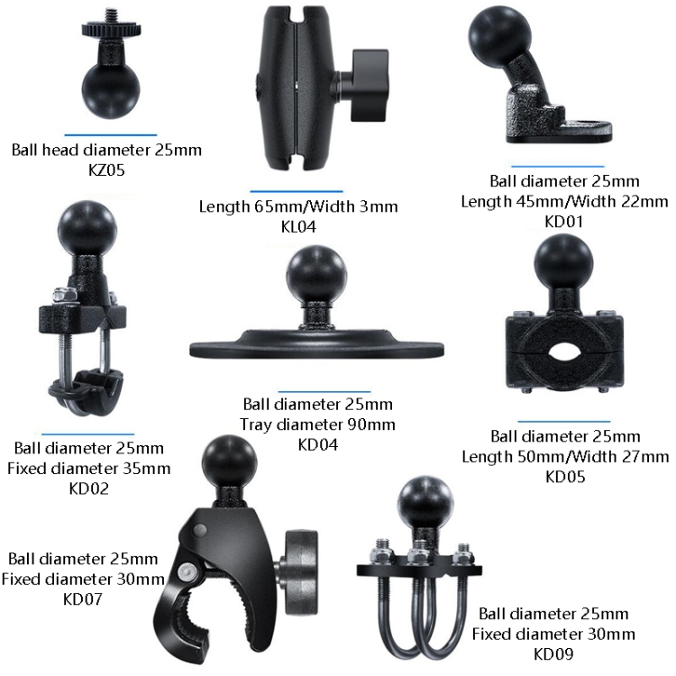3. Size: KZ05 ball head diameter is about 25mm, KL04 is about 65mm long/width is about 3mm, KD01 is ball diameter is about 25mm/length is about 45mm/width is about 22mm, KD02 is ball diameter is about 25mm/fixed diameter is about 35mm, KD04 is ball diameter is about 25mm /Tray diameter is about 90mm, KD05 sphere diameter is about 25mm/length is about 50mm/width is about 27mm, KD07/KD09 sphere diameter is about 25mm/fixed diameter is about 30mm