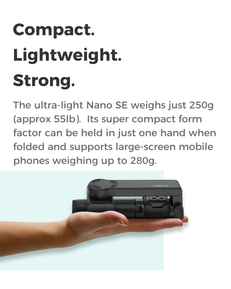 3. The ultra-light NANO SE weighs just 250g (approx 55lb). Its super compact form factor can be held in just one hand when folded and supports large-screen mobile phones weighing up to 280g.