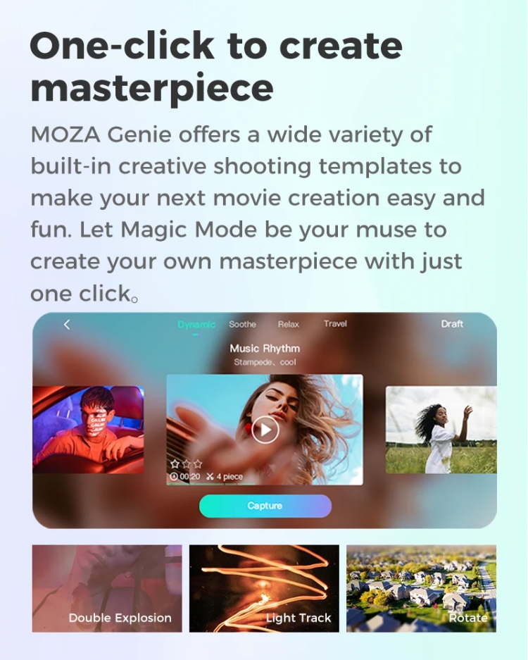 4. MOZA Genie offers a wide variety of built-in creative shooting templates to make your next movie creation easy and fun.