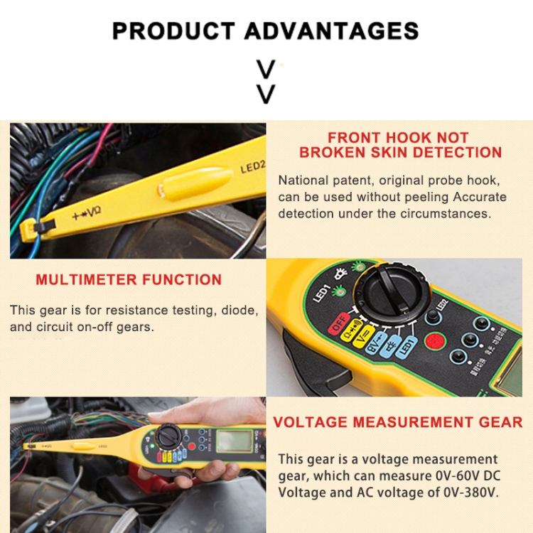 1. Its front end has unique feeler which searches circuit. It can accurately detect all faults like voltage and signa inside wire on the surface of wire rubber cover (convenient and efficient detection).