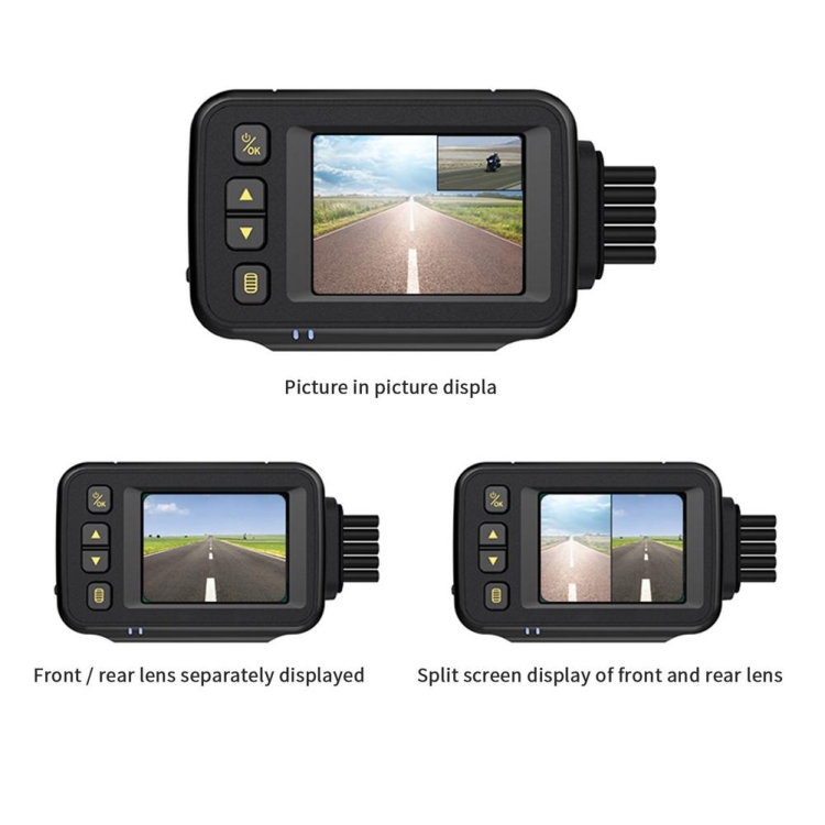 5. 2.0 HD display, support split-screen preview, support 3 display modes (Picture-in-picture display/front and rear lens display separately/front and rear lens split-screen display), the page is simplified and clear at a glance