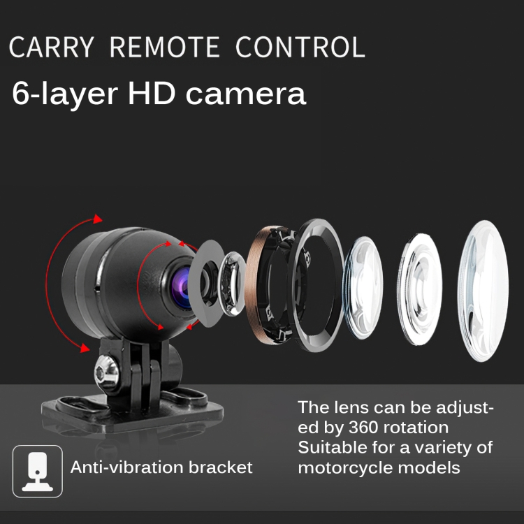 2. 6-layer high-definition camera, 6 groups of optical glass lenses, the color is more vivid, the picture is clear, the image is recorded in high-definition, the lens can be rotated 360 degrees, can also be adjusted up and down, suitable for a variety of motorcycle models, with anti-vibration lens holder