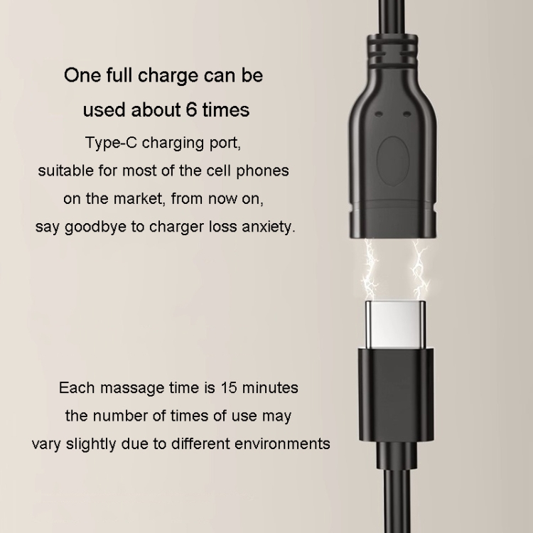 9. Each massage time for 15 minutes, charging models full of electricity available about 6 times, Type-C charging port, suitable for most of the cell phones on the market