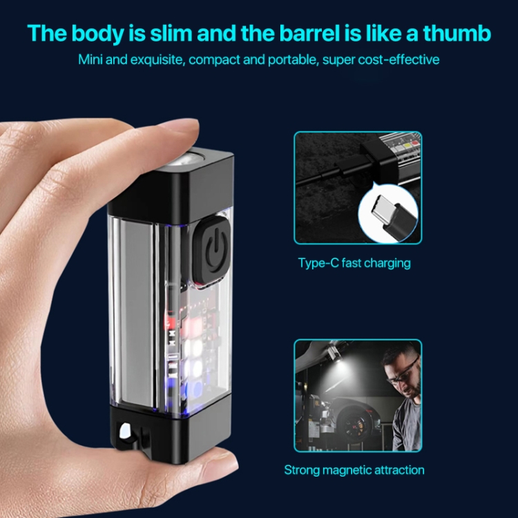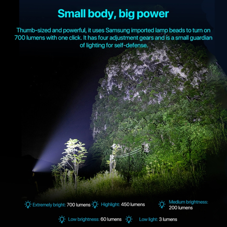 1. This product is a multifunctional strong flashlight designed with the main characteristics of mini refinement, excellent performance, and portability, combined with practical life. As small as a thumb and it is only 19g. And it can be hung on a keychain for use.