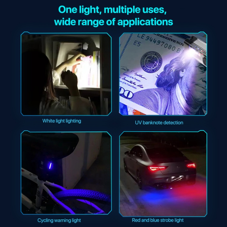 5. Side UV purple light, which can be used for currency verification, fluorescent agent detection, anti-counterfeiting identification, etc
