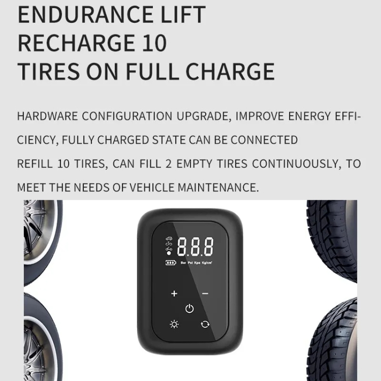 5. Improved battery life, fully charged can refill 10 tires, and can continuously fill 2 empty tires to meet vehicle maintenance needs