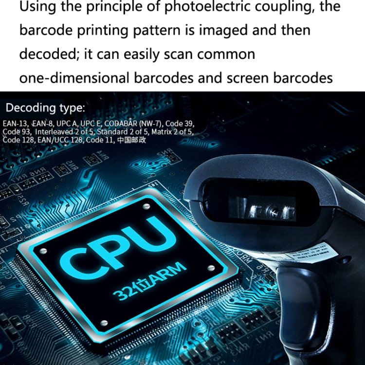4. Using the principle of photoelectric coupling, the barcode printing pattern is imaged and then decoded; it can easily scan common one-dimensional barcodes and screen barcodes