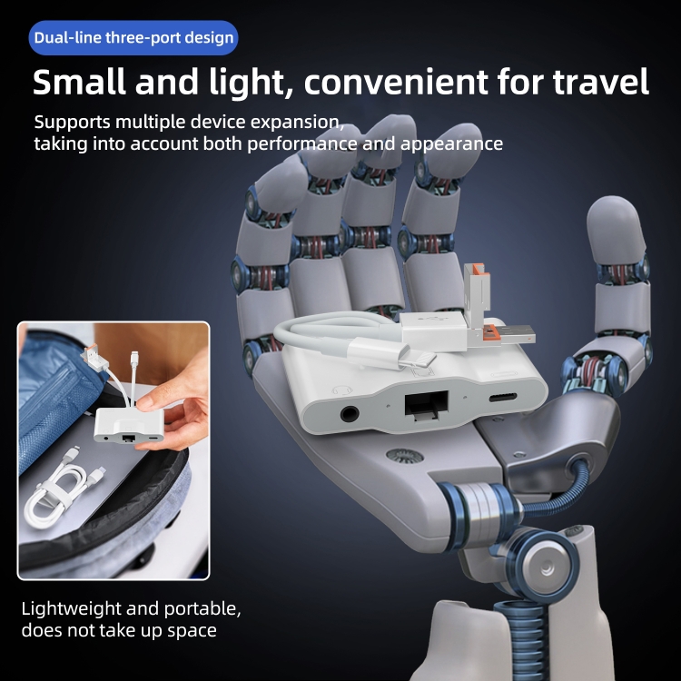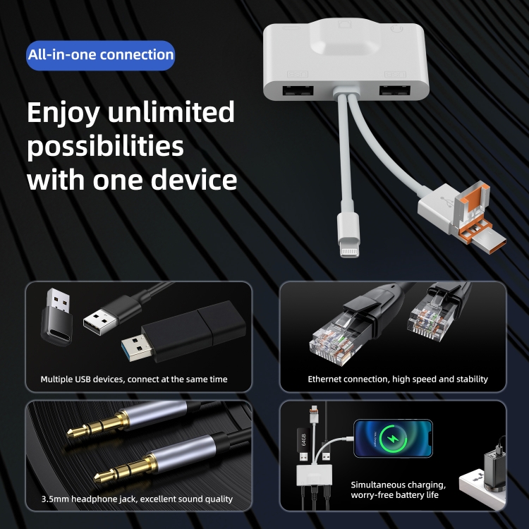 Type-C/8 Pin/USB-A multi-function adapter, through the RJ45 interface, can connect Type-C/8 Pin/USB-A interface devices to Ethernet, so as to achieve continuous and fast Internet access. When surfing the Internet, use the 3.5mm audio socket to play the sound outward to experience a different feeling. Use the USB and Type-C sockets to import photos directly from the digital camera to the device with a data cable and converter. It can also expand the device with the lowest power consumption USB flash drive, keyboard or use 3.5mm headphones while charging the device.