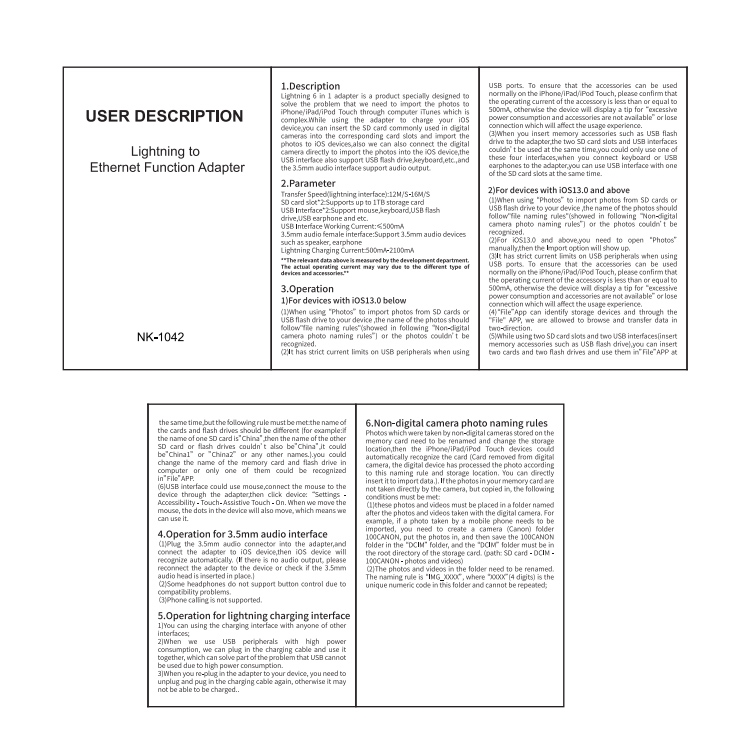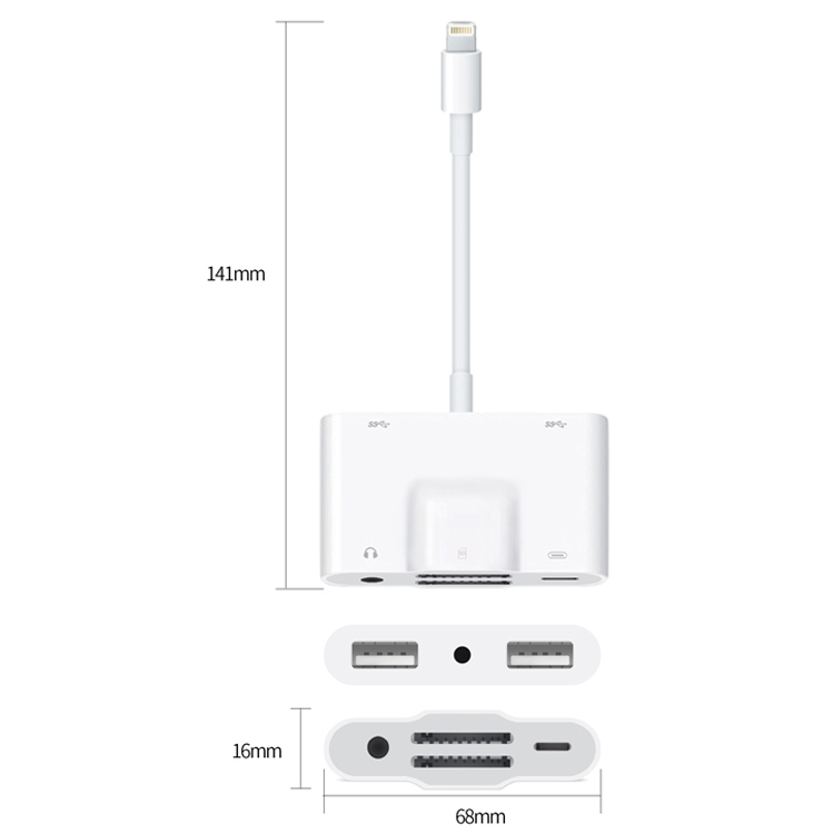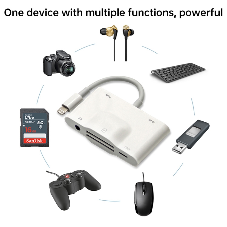 NK-1042 6 in 1 8 Pin Male to Dual USB + Dual SD Card + 3.5mm Audio Interface + 8 Pin Charging Interface Female Port Camera Adapter