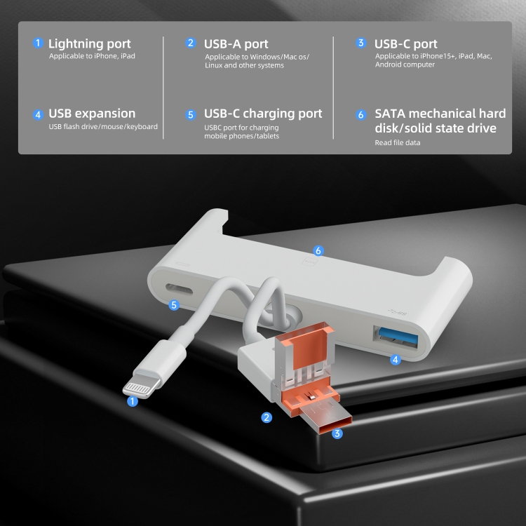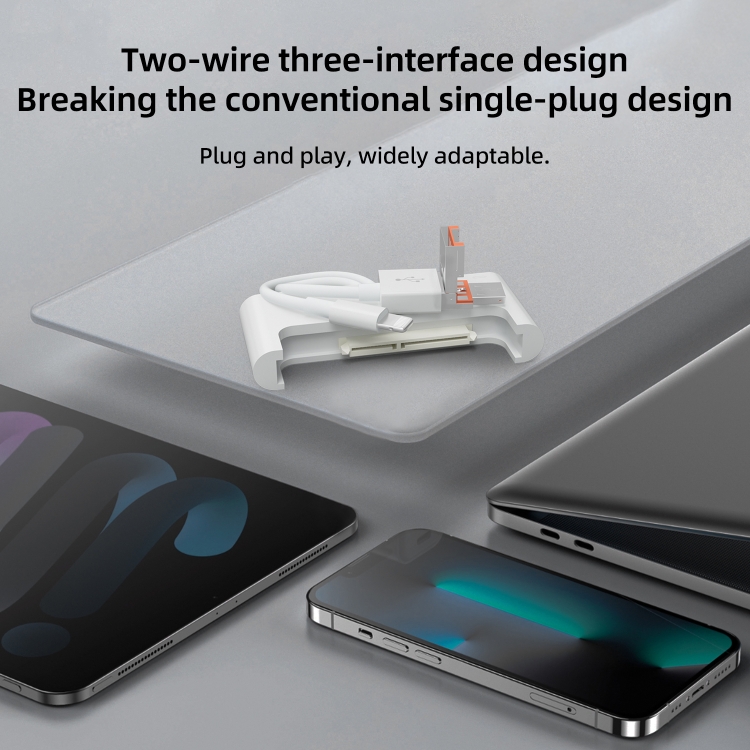 NK-1046TL Pro multi-function adapter is a converter specially developed for drama lovers and office workers who are accustomed to mobile hard drives. The adapters Type-C, USB, and SATA interfaces allow users to easily back up files in the hard drive on mobile devices while ensuring the battery life of the device, watch audio and video, and expand the diversity of USB peripheral functions (the adapter needs to be plugged into the Type-C charging cable on the 8-pin device to operate the SATA interface).