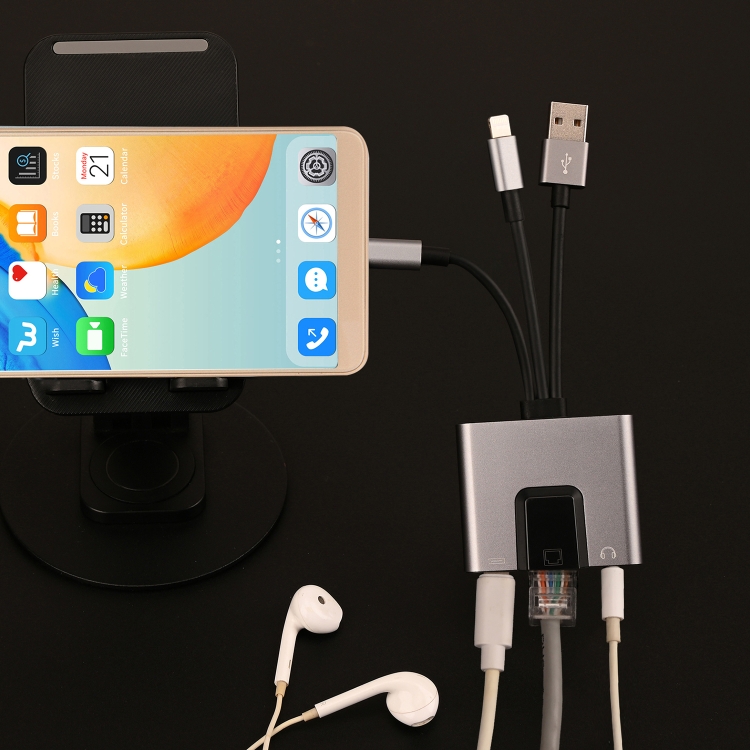 NK-1056S 3 in 1 8 Pin, Type-C, USB to 8 Pin Charging, Ethernet Port, 3.5mm Earphone Multifunctional Converter
