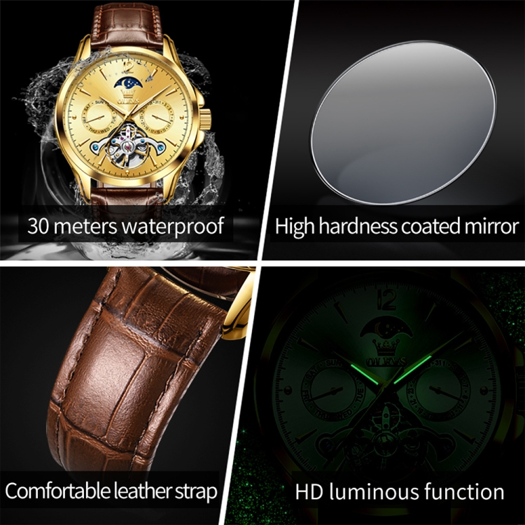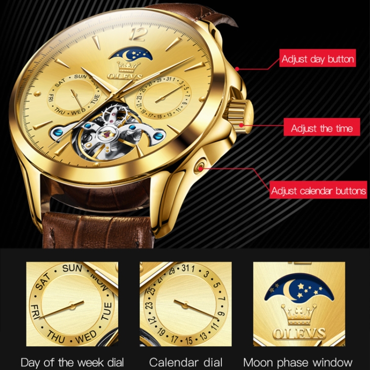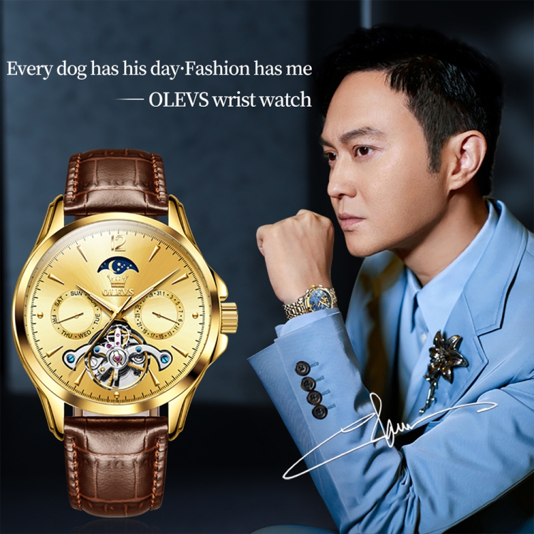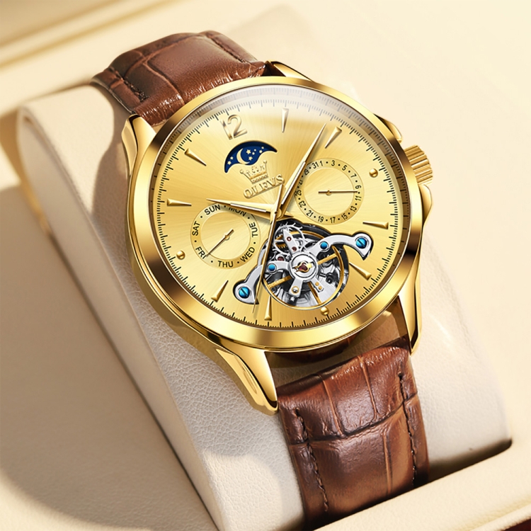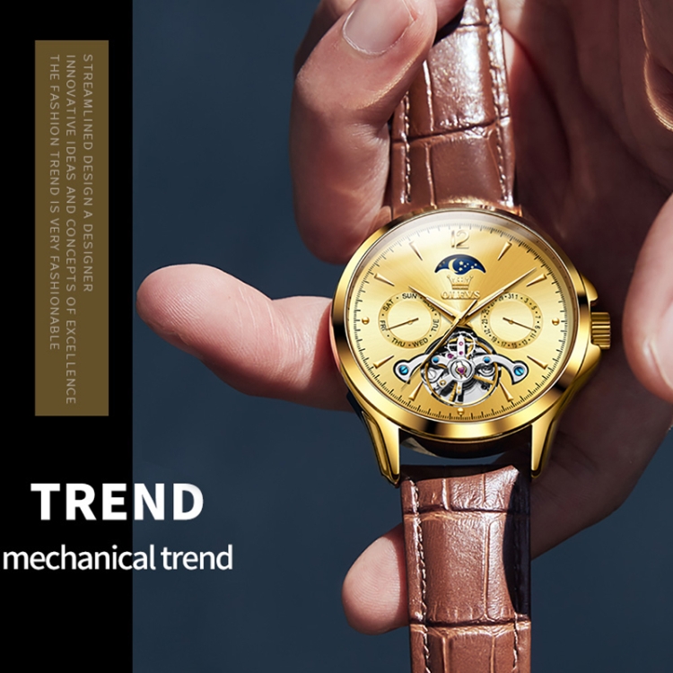 OLEVS 6650 Men Multifunctional Waterproof Hollow Leather Strap Mechanical Watch