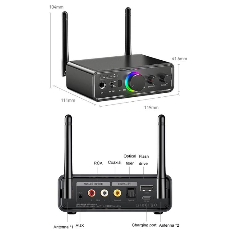 8. Interface type: input: 3.5mm AUX + RCA + optical + coaxial + USB; output: 3.5mm AUX + RCA