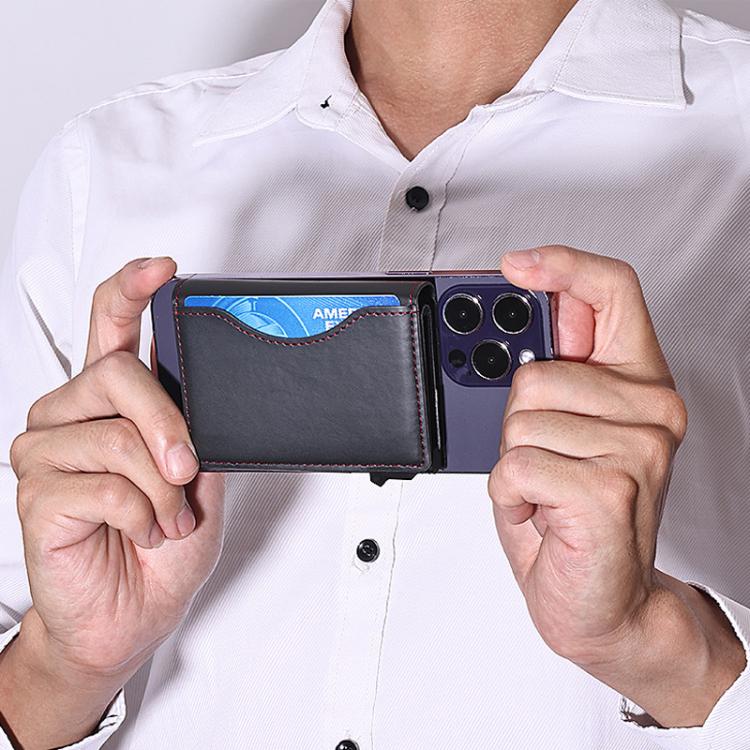 1. A sleek, MagSafe-compatible card holder designed for iPhone users seeking security, convenience, and minimalist style. Features a one-click pop-up mechanism, RFID-blocking tech, and a lightweight aluminum-PU build for seamless daily carry.