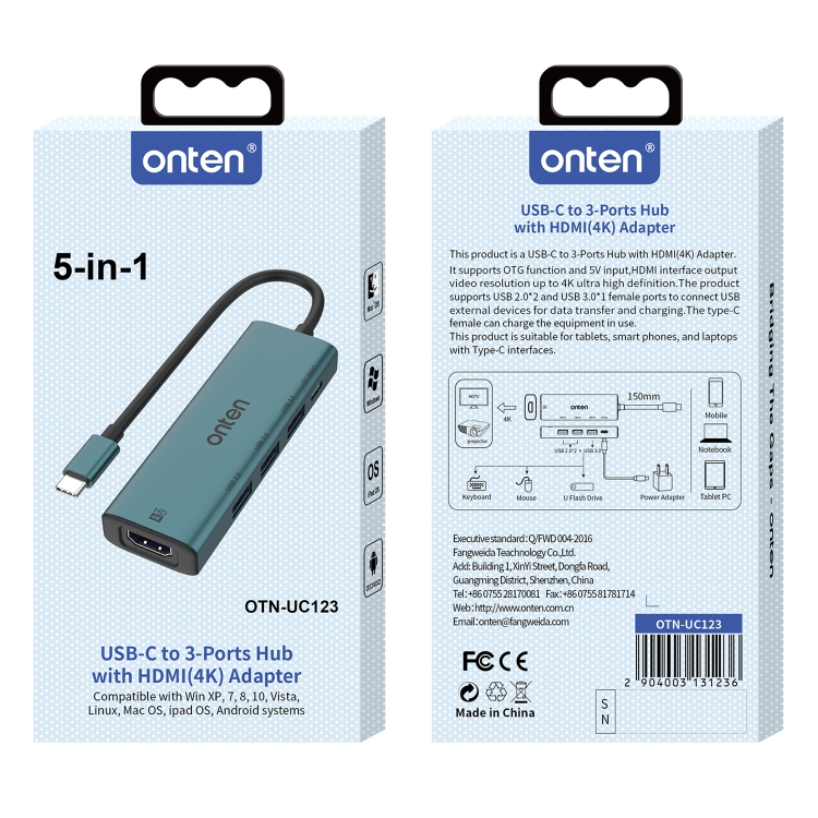 Onten UC123 5 in 1 USB-C / Type-C to HDMI + USB3.0 HUB Docking Station with 5V Input