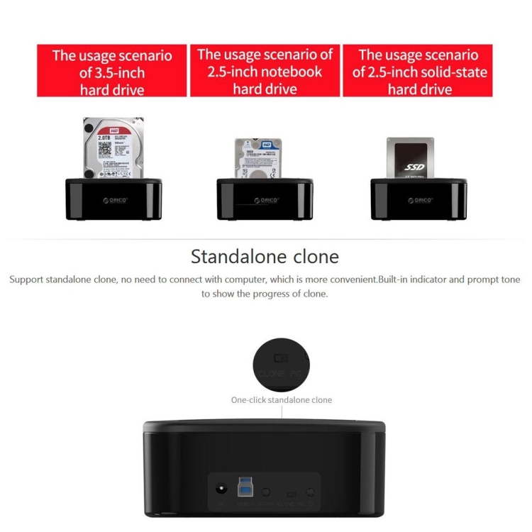 ORICO 6228US3-C 1 to 1 Clone 2 Bay USB 3.0 Type-B to SATA External Storage Hard Drive Dock for 2.5 inch / 3.5 inch SATA HDD / SSD