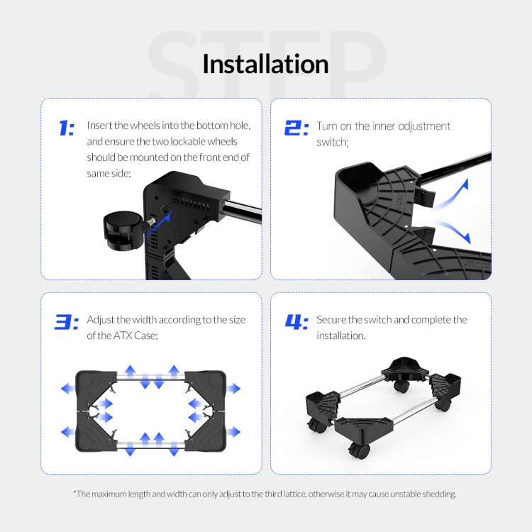 3. This PC tower stand has four casters(2 lockable wheels), designed to improve mobility and stability, you can easily move the computer. Insert the wheels into the bottom hole, and ensure the two lockable wheels should be mounted on the front end of the same side