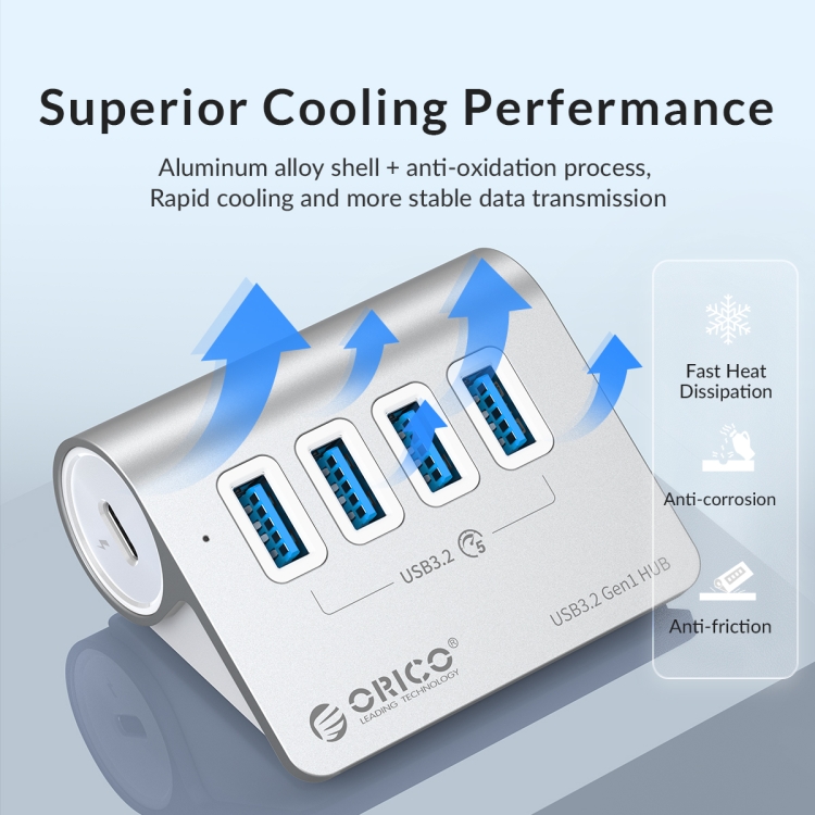 4. 5V 2A Power Supply Interface: ORICO USB 3.2 aluminum Hub reserved USB-C 5V power supply interface, can be external 5V 2A power supply sufficient to ensure the normal operation of high-power USB devices; (This product package does not include the power adapter) Support hot-plug, no driver.
