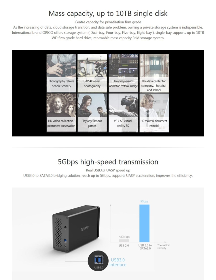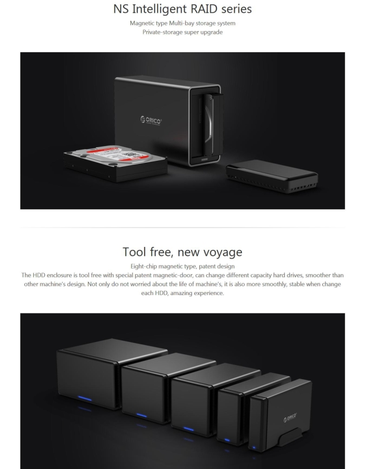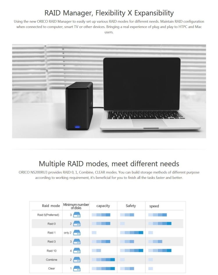 5. RAID Manager, Flexibility X Expansibility: Using the new ORICO RAID Manager to easily set up various RAID modes for different needs. Maintain RAID configuration when connected to computer, smart TV or other devices. Bringing a real experience of plug and play to HTPC and Mac users.